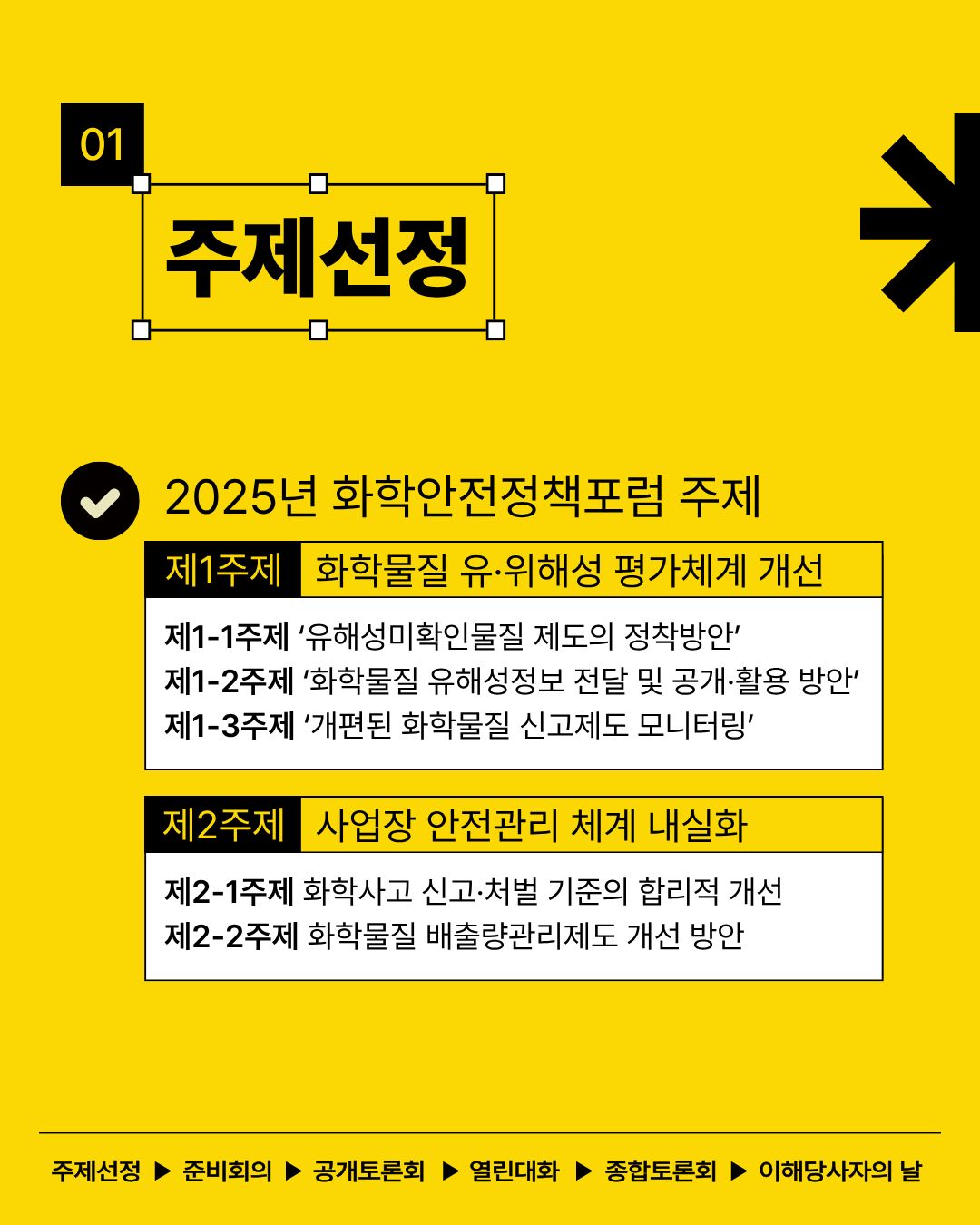 이렇게 선정된 2025년 화학안전정책포럼 토론 주제는 다음과 같습니다.
