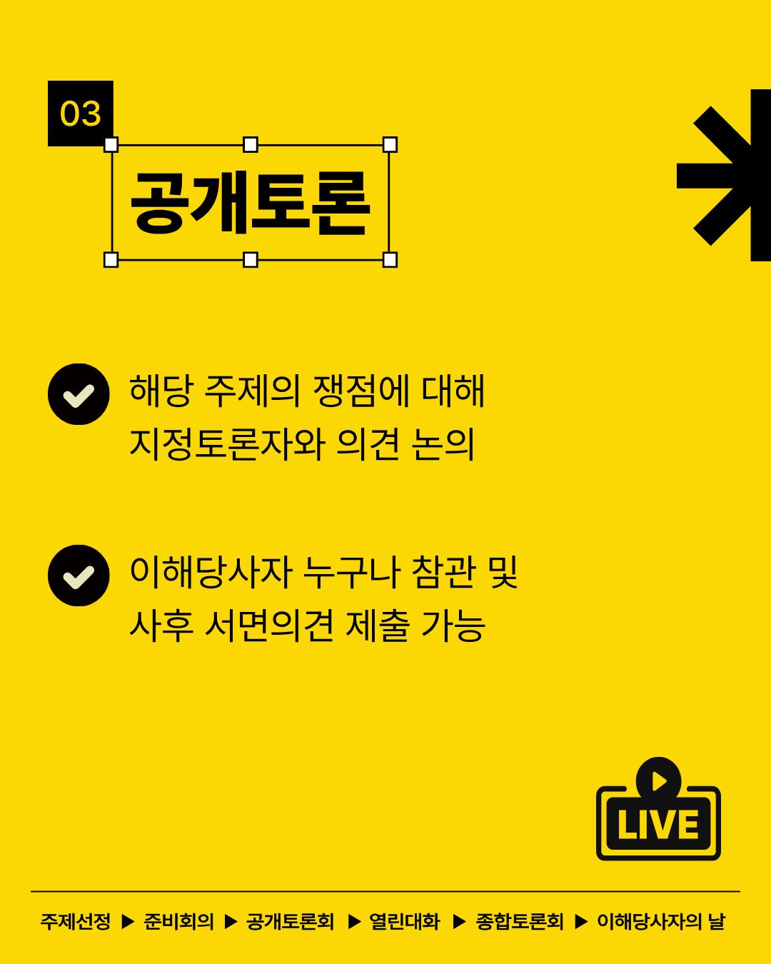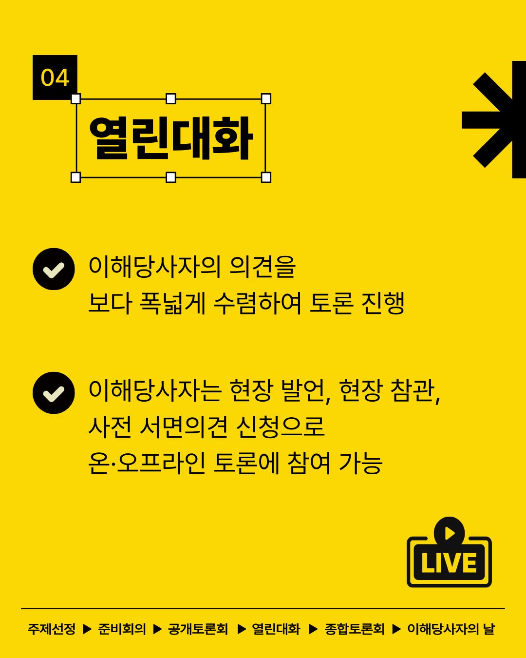 열린대화 역시 온라인으로 중계되며, 이해당사자는 미리 발언·참관 신청을 통해 온라인이나 현장 토론에 참여할 수 있습니다.