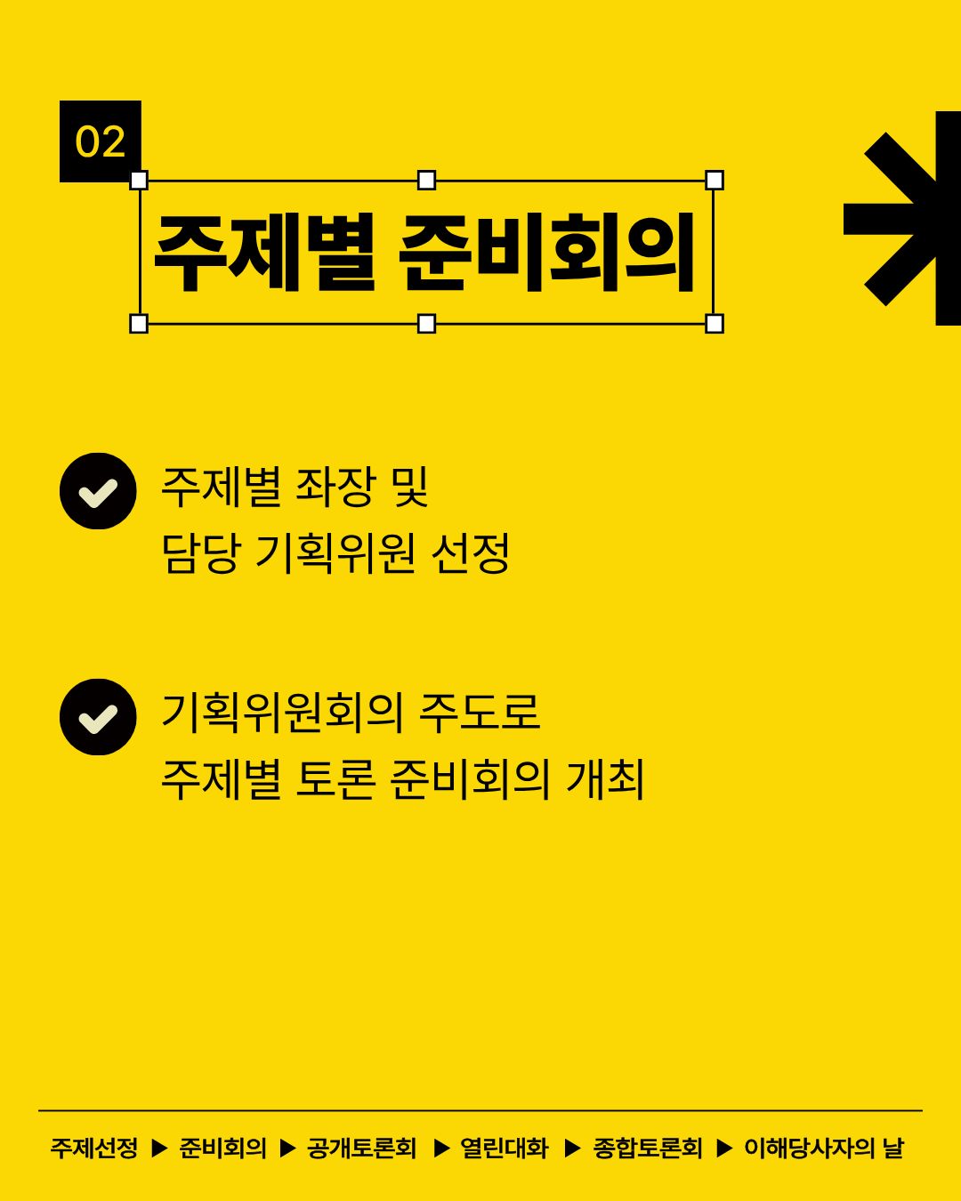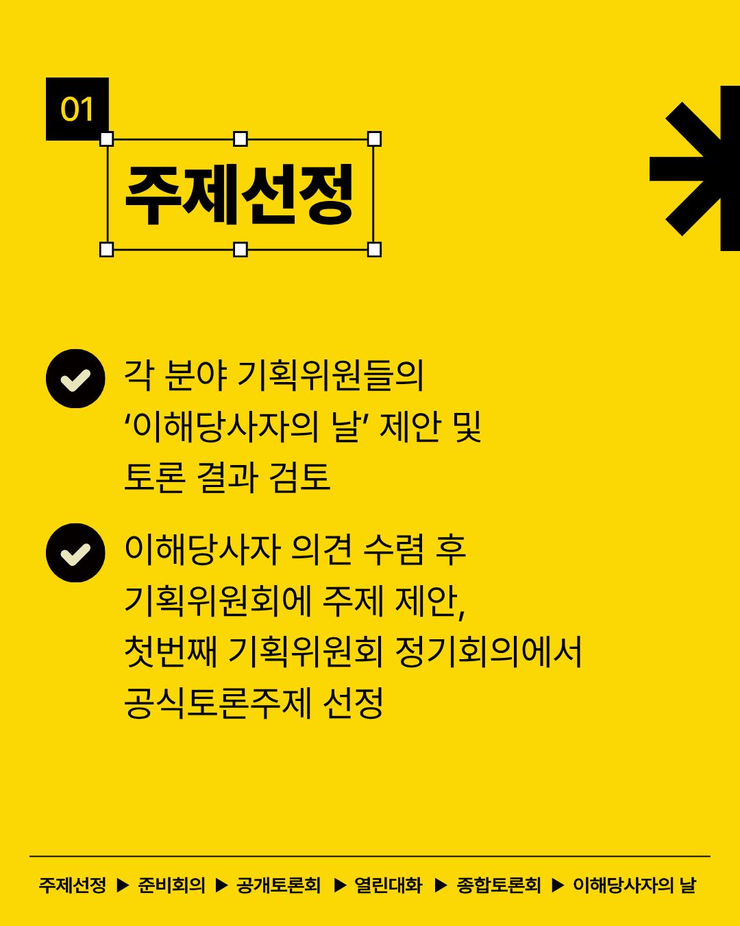 그럼 주제선정부터 종합토론회까지의 과정을 살펴볼까요?