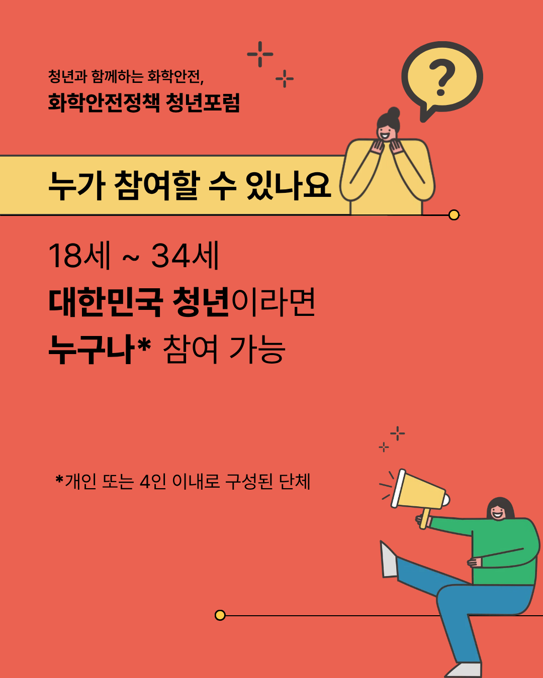 화학안전정책 청년포럼은 18세~34세 대한민국 청년이라면 개인 또는 4인 이내로 구성된 단체의 형태로 누구나 참여 가능합니다.